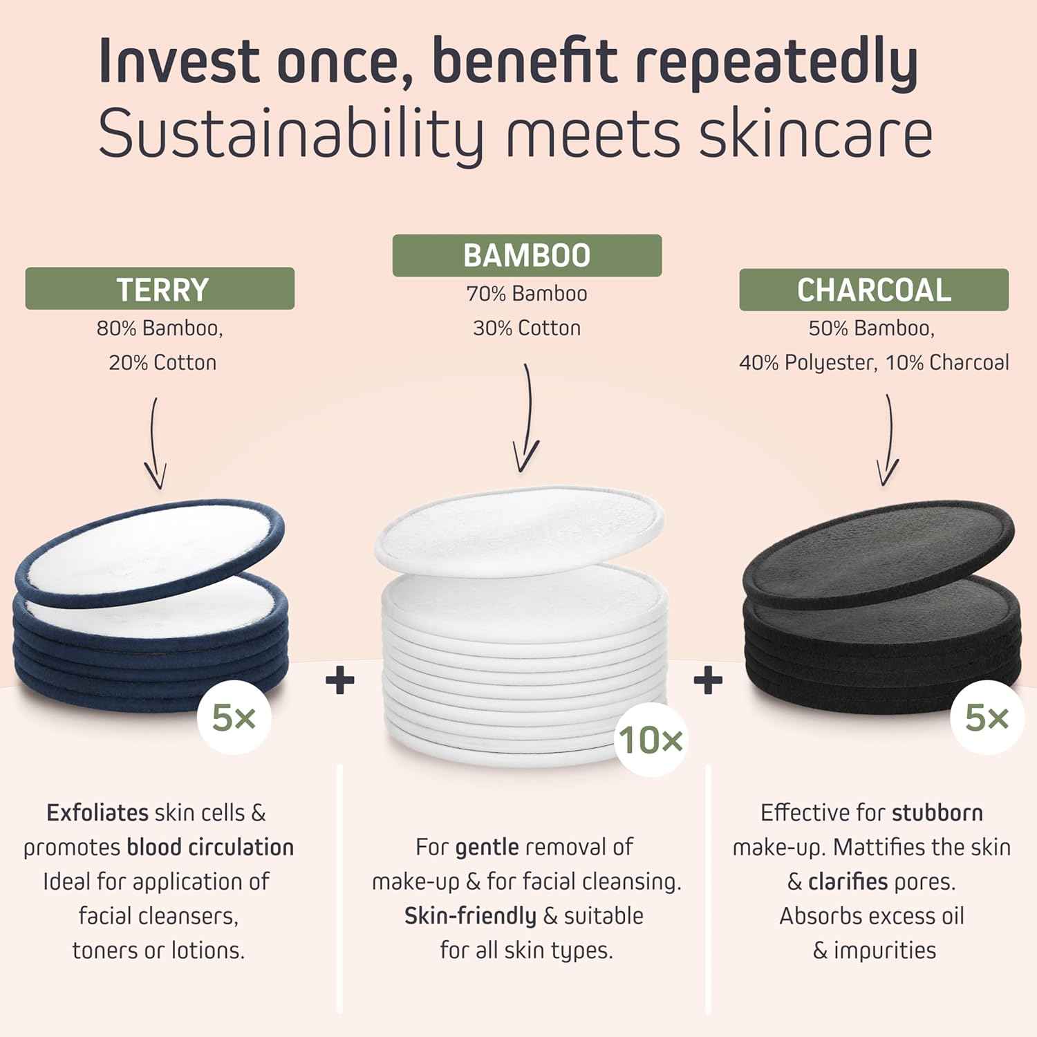 Eco-friendly reusable makeup pads made from bamboo, terry, and charcoal blends. Soft, washable, and perfect for daily cleansing. Includes 20 pads, a laundry bag, and a metal storage tin for zero-waste skincare.