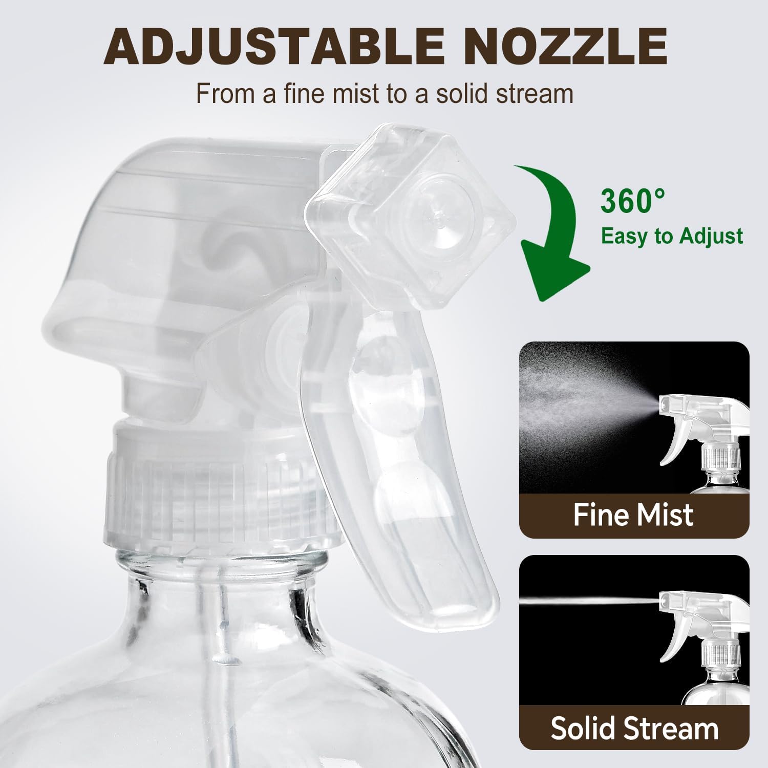 Sturdy glass spray bottles with protective silicone sleeves and adjustable mist/stream nozzles. Perfect for homemade cleaners, plant misting, and everyday household use. Includes green and grey bottles.